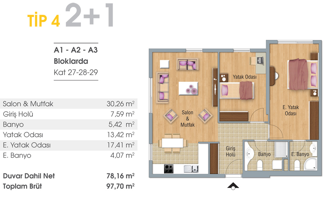 TİP 4 2+1 A1-A2-A3 Bloklarda Kat 27-28-29