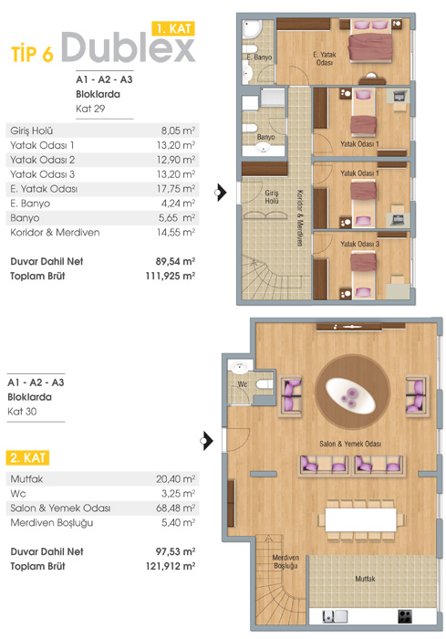 TİP 6 Dublex A1-A2-A3 Bloklarda Alt Kat 29 Üst Kat 30